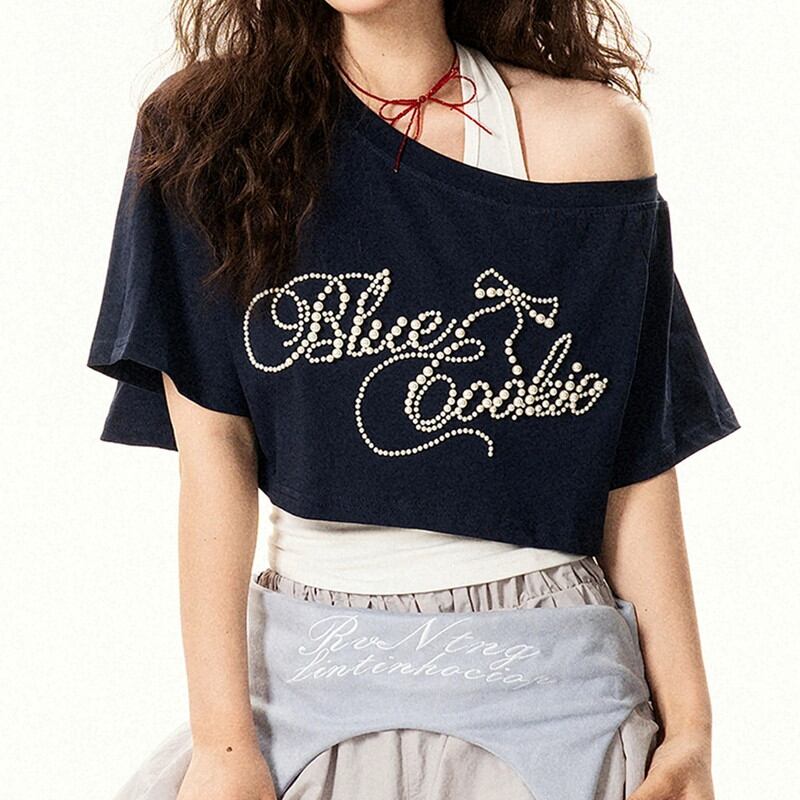 プリントが目を引くクロップド丈の半袖Tシャツ。