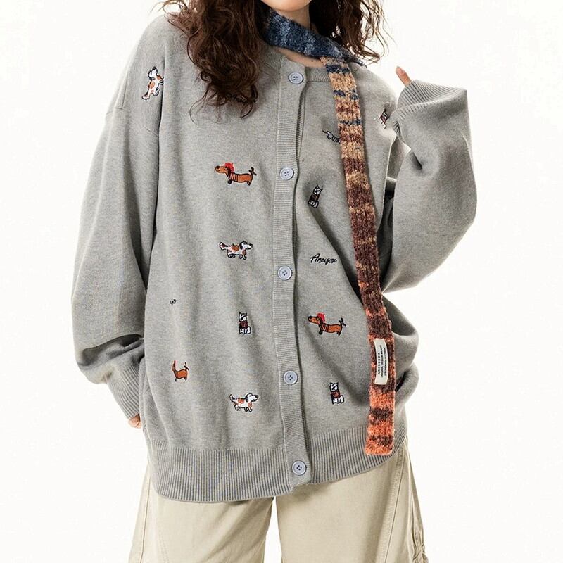 セーター全体に散りばめられた、愛らしい犬の刺繍がアクセントとなり、