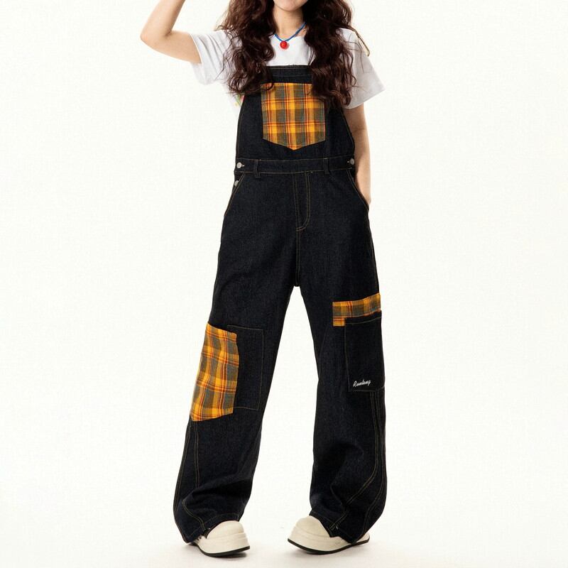 チェック柄のパッチワークとデニムのコントラストが目を引く、デザイン性の高いサロペット。