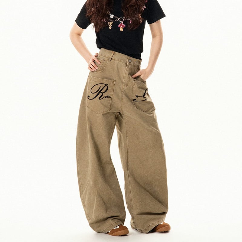 Button Fly Front Embroidered Pocket Wide Pants ◇2color M0113
